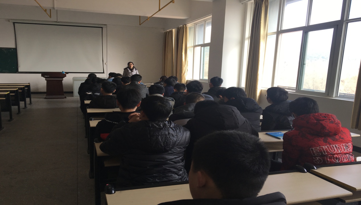 胡老师首先就原任班主任程威老师的工作调动和学院更名做了说明,接着从员工安全、学期规划、学雷锋活动、寒假作业等几个方面做了强调和要求。 胡老师首先强调了安全问题,她从一个小小插座引发的火灾实例讲起,强调了用电和财产安全,提醒同学们不要使用劣质接线板和插座,不要在寝室抽烟、使用热得快。 要人走锁门,她要求要严格执行五项制度和五条禁令。 接着,胡老师提出要做好新学期的规划, 她分别从学习、就业、早锻炼等方面对同学们提出建议,要求大家坚持早锻炼,坚持打卡,了解自己的学业状况,把握和珍惜每一次补考机会,尽快消灭不及格课程;多参加学科竞赛,为就业增加“砝码”和“敲门砖”。对3月学雷锋活动,胡老师提议在3月5日这一天,每个同学做一件好人好事,以实际行动践行雷锋精神。最后,胡老师向同学们表达了自己对全班同学的殷切期望,希望每个同学合理安排和规划自己的大学时光,争取全部顺利毕业,顺利就业,她同时表示,将付出最大的热情和能力服务好大家,做好同学们的人生导师和知心朋友。