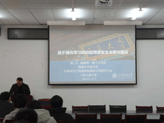 在本次报告中,胡川副教授聚焦复杂环境下智能汽车的安全决策、规划与控制核心议题,通过基于周边车辆不确定性的自动驾驶非保守运动规划、改进型耦合深度强化学习决策框架等一系列前沿技术案例,系统阐释了汽车具身智能、深度学习模型构建等兼具学术深度与应用前景的研究方向。报告内容兼具理论高度与实践指导性,为在场师生打开了跨学科研究的全新视野,提供了极具价值的研究思路与方法借鉴,彰显了重要的学术指导意义。