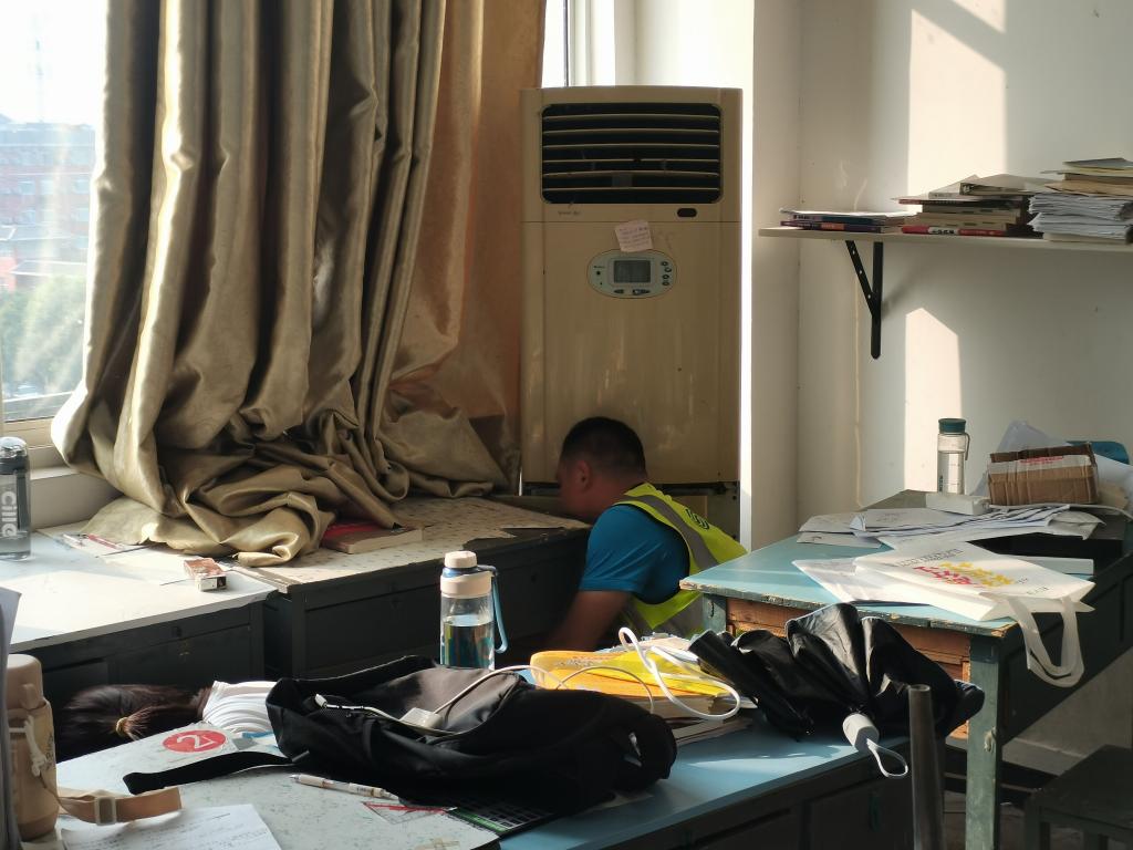 同学们早早的将扫把、拖把、抹布等工具放在自习室旁边,整理活动正式开始后,他们根据清洁任务的需要,进行了合理分工。为方便窗户清洁,负责擦窗户的同学特地带来了玻璃清洁剂,之后再用废旧报纸去除残留物。负责扫地、拖地、清理杂物的同学,他们对待工作也格外认真,对自习室的边边角角打扫得干干净净。吴老师还请了专业人员对自习室的空调和网线进行了维护,保证考研学子们的学习和生活正常使用。活动整理后,同学们将桌椅摆放整齐,物归原位。