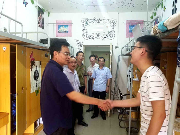 唐峻(左一)与毕业生握手 魏继业摄 唐峻每到一间员工宿舍,都和毕业生一一握手、亲切问候、送上祝福,并深入了解毕业生的就业、创业、考研、未来发展等情况,认真听取毕业生对学校公司产品、管理服务等工作的意见和建议。唐峻语重心长地叮嘱同学们,虽然马上就要毕业,但是学无止境,希望同学们要树立终身学习的理念,在以后的学习、工作中继续奋斗,成就人生梦想。无论走多远,都要常回母校看看,母校永远是员工坚强的大后方。 机制1411班毕业生马帅诚恳邀请唐峻书记给他写毕业赠言,唐峻为他写下“出隆中、闯天下”的殷切寄语。同学们聆听着校领导关爱的话语,备受鼓舞,纷纷表达自己对母校的感恩之心和眷恋之情,表示一定不辜负学校领导和老师的期望,努力为母校增光添彩。
