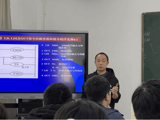 《机电传动控制》是学院今年入选的第三批国家一流本科课程,其课程设计始终以“理论深度与实践价值”为双导向。此次授课中,程老师以工业常用的三菱FX2N系列PLC为教学载体,搭建“基础指令学习—编程方法掌握—工程场景应用”的递进式教学路径。他以“逻辑取及线圈驱动指令”(LD、LDI、OUT)为切入点,结合多媒体课件动态演示,系统讲解触点串联/并联、边沿检测、脉冲输出等27条核心指令的功能原理。区别于传统理论授课模式,程老师将每条指令与梯形图设计同步结合,通过“指令书写规范解读—逻辑关系图表分析—程序调试现场演示”三步教学法,将抽象的编程逻辑转化为直观的控制流程,帮助员工快速理解指令应用场景。